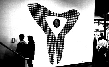 As the artist-in-residence at the Artist Foundation in Boston, MA the artist executed a series of installations in a public atrium having to do with symbols and gender. This work, a billboard size image of two high heels, was made up of hundreds of slips of paper stapled directly to the wall. On each slip was a laser printed international female symbol commonly found on restroom doors. In the center of this image on a round wood panel were fragments of what looked to be a primitive vaginal form.