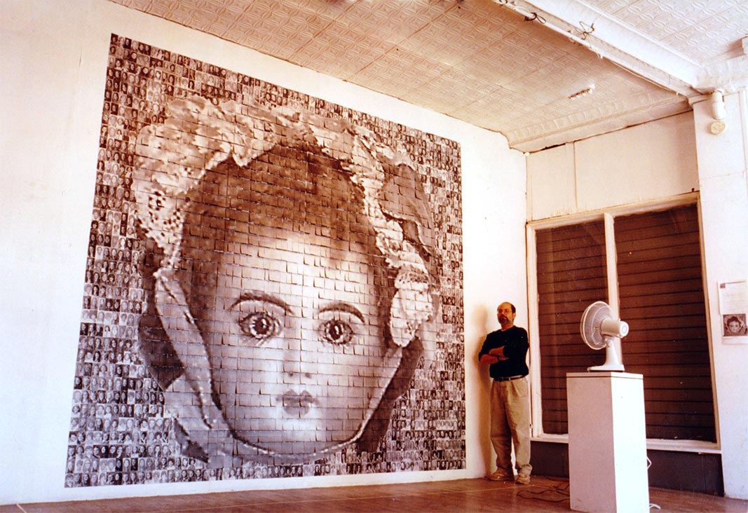 This paper mosaic was made of more than 5000 laser printed images, each was hand cut and stapled directly to the gallery wall. The images depicted are all the girls from the artist's high school yearbook (George Washington High School, Class of 1973, Denver, Colorado) and a face scanned from a doll collectors' catalog.