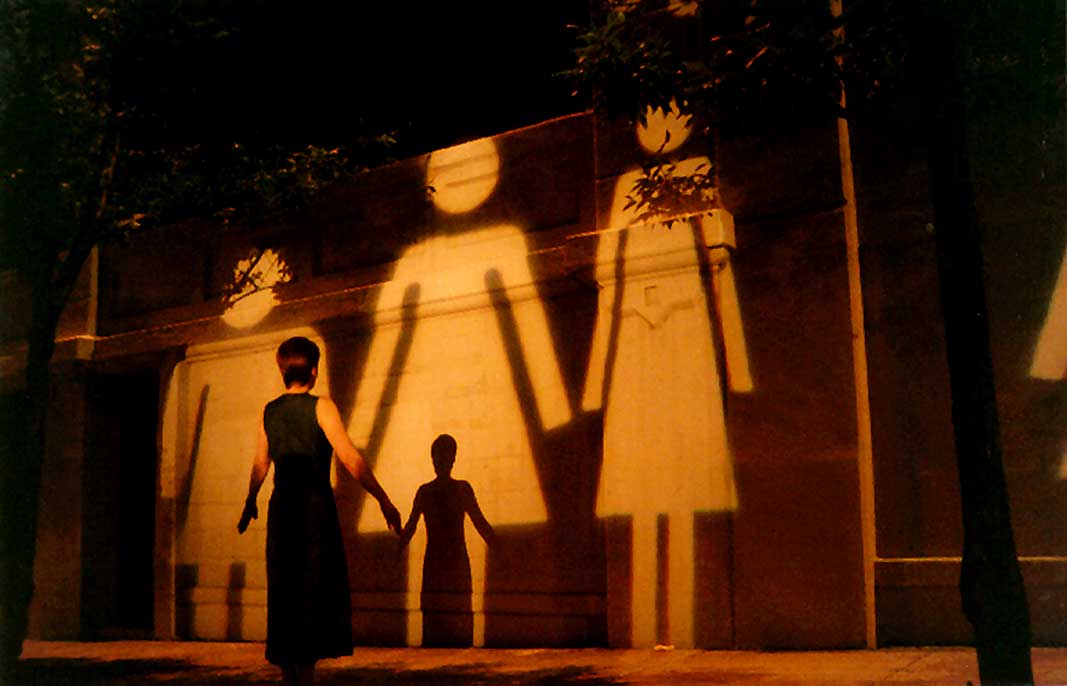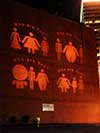For the 1999 Convergence International Art Festival the artist projected symbols of men and women on walls throughout downtown Providence, RI. These figures, based on the international symbols for men and women, were in groups of three. Each triad included the standard boy or girl symbol and two additional figures.