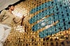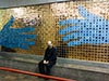 The background of the mural is made up of shiny gold tiles each with the standard symbol for men or women. These symbolize the anonymity of a traveler. The two outstretched hands are made up of turquoise tiles each with an individual figure. The turquoise tiles depict a wide variety of figures; some are thin, heavy, tall, short, young, and old. Others have oversized large heads others have tiny heads. These can be interpreted as different ways of thinking or perhaps ego. The turquoise tile figures symbolize the diversity of the bus station visitors without reference to race, religion, or politics.