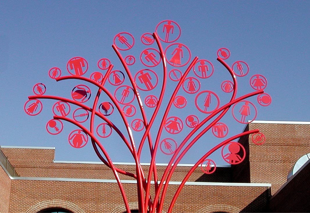This artwork symbolizes the diversity of the Clinton Avenue School in New Haven, CT. The student body is made up of a multiplicity of peoples and personalities yet all are united under the American tree. The figures are further unified by a single color and yet represent a diversity of ideas without reference to race, religion, or culture.