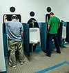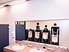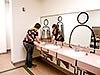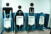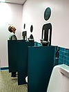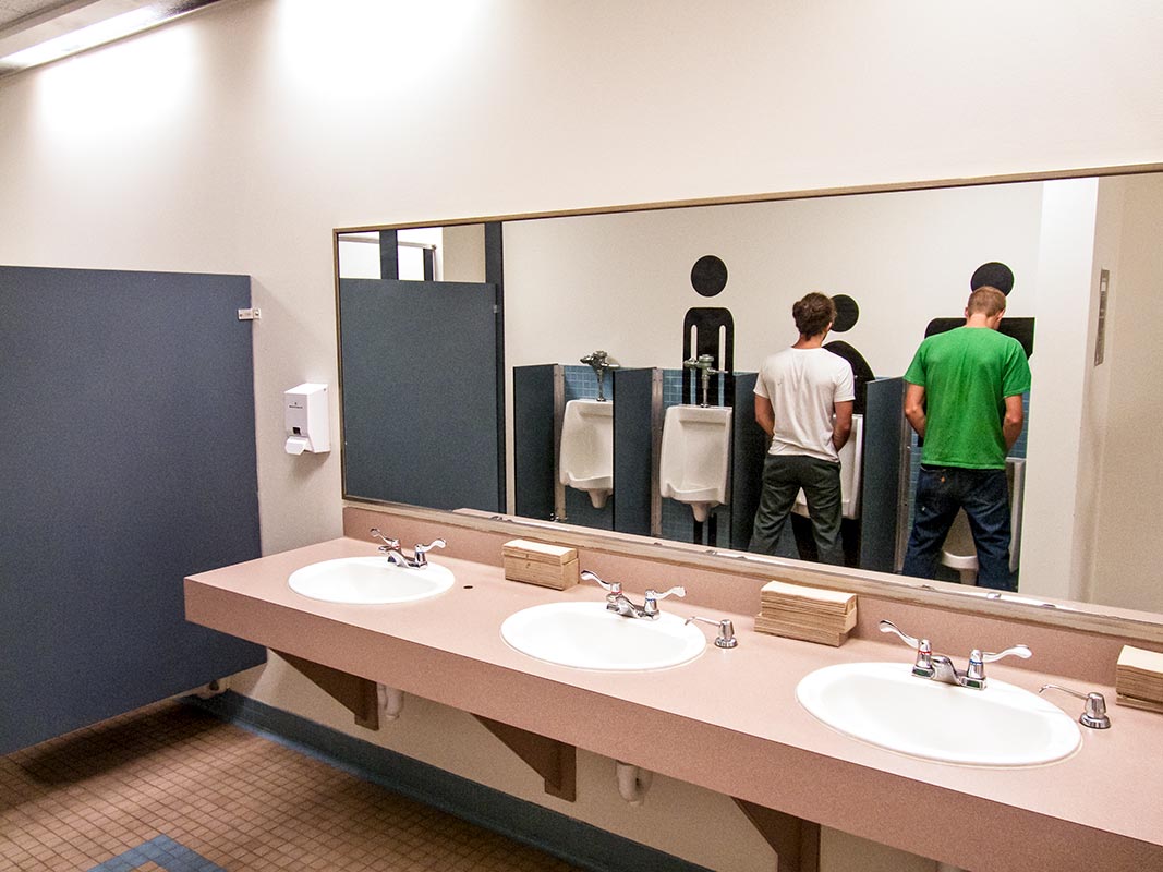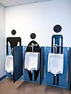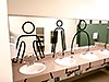 The site specific installations are located in the restrooms immediately opposite the main gallery. The iconic figures in the men's restroom are painted directly on the walls surrounding three of the four urinals. The figures in the women's restroom are vinyl decals applied to the mirrors in front of three of the four wash basins. The figures in both bathrooms are stylistically similar to the international symbols for male and female.